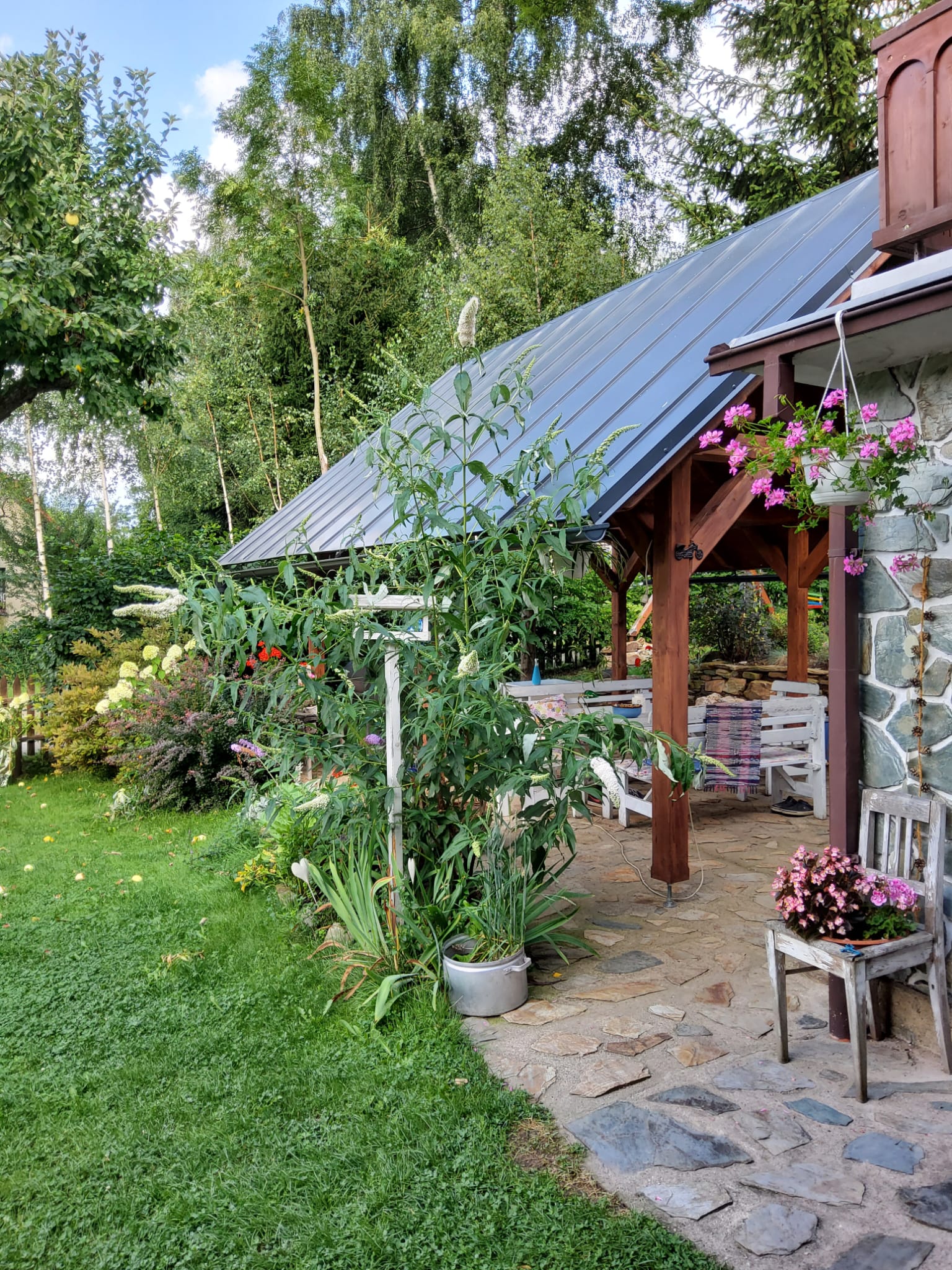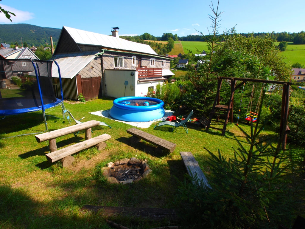 * ZAHRADA částečně oplocená s dostatkem prostoru pro hry v letních měsících s trampolínou a bazénem o průměru 4m. Dále je zde velká pergola, prolézačka, pískoviště, ohniště s lavicemi a stolkem, uzavíratelná studánka, kde se výborně chladí pivo a jezírko s rybičkami. Zdarma můžete využít gril na dřevěné uhlí, bandbington, líný tenis, petanque, míče apod.