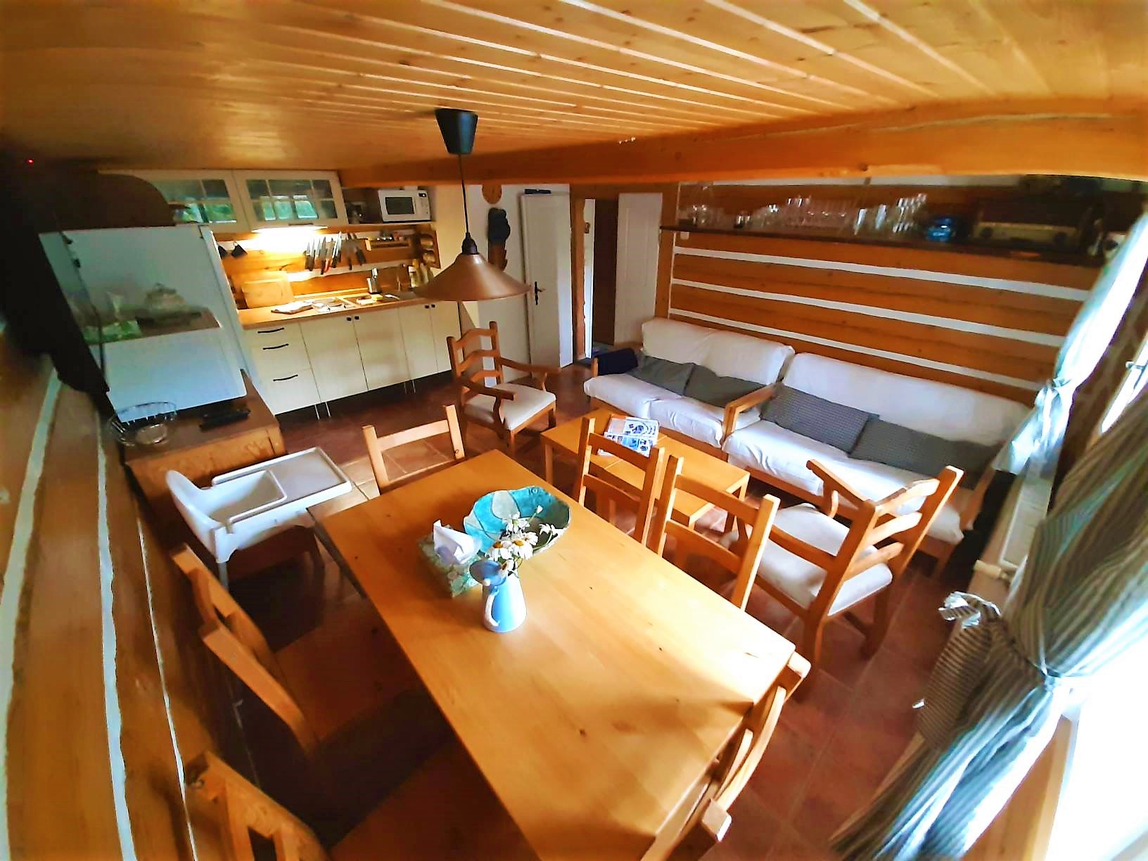 Ideální poloha roubené chalupy jen kousek od sjezdovek se stylově vybaveným, prostorným ubytováním ve vybaveném apartmánu 4+kk+terasa (125 m2) v 1. patře velkého roubeného stavení (220 m2) nabízí odpočinek a mnoho příjemných zážitků pro setkání přátel nebo více genarací celé rodiny. Ubytování je ideální pro 3 rodiny s dětmi nebo prarodiče se svou rodinou. Klienti mají plně k dispozici celou zahradu (s pergolou, ohništěm, grilem, posezením a v létě i trampolínou a bazénem), parkoviště přímo u chalupy a celé horní patro 4+kk s terasou, koupelnou a 2x WC. Přízemí je obýváno majitelem nemovitosti.