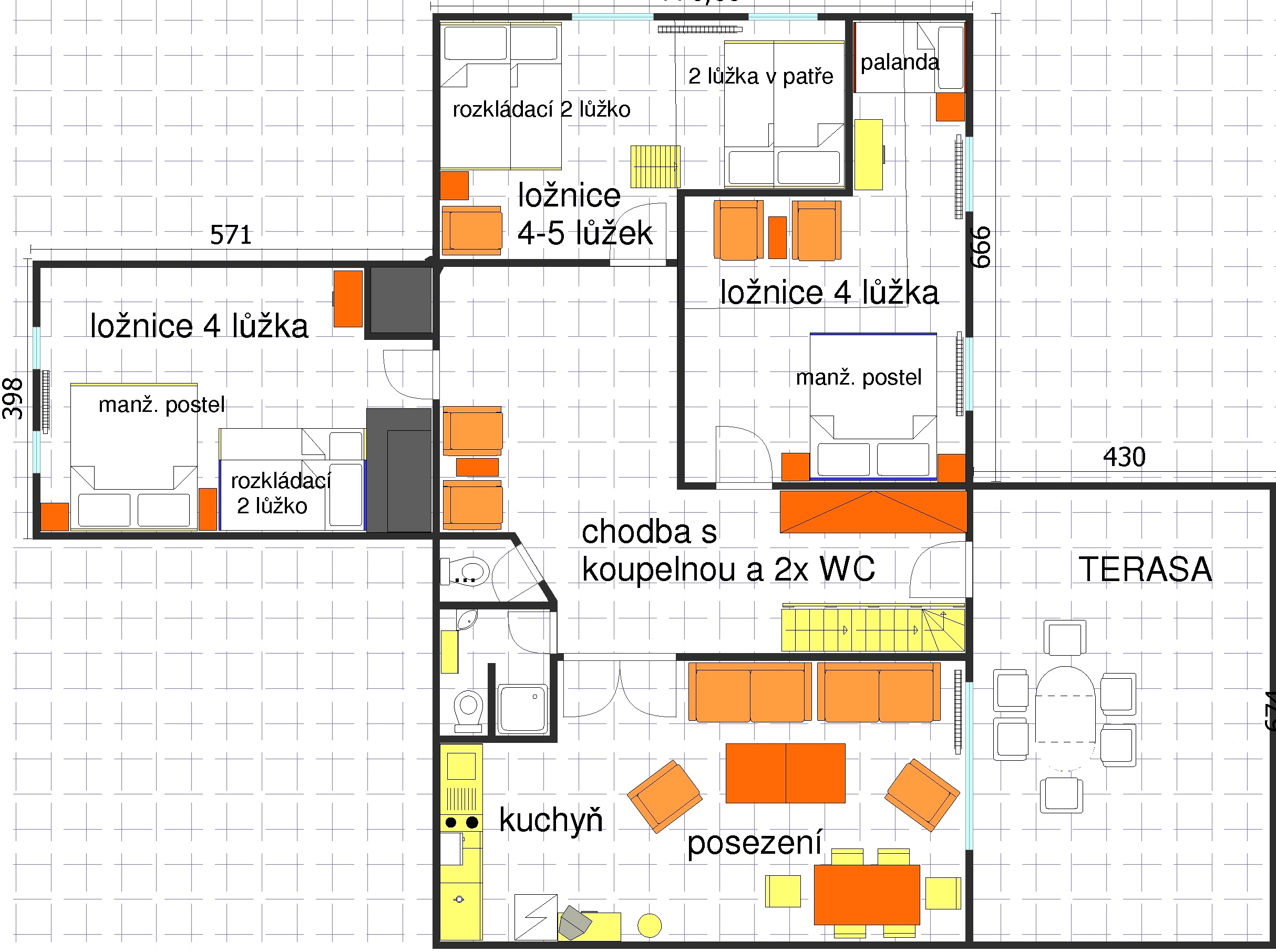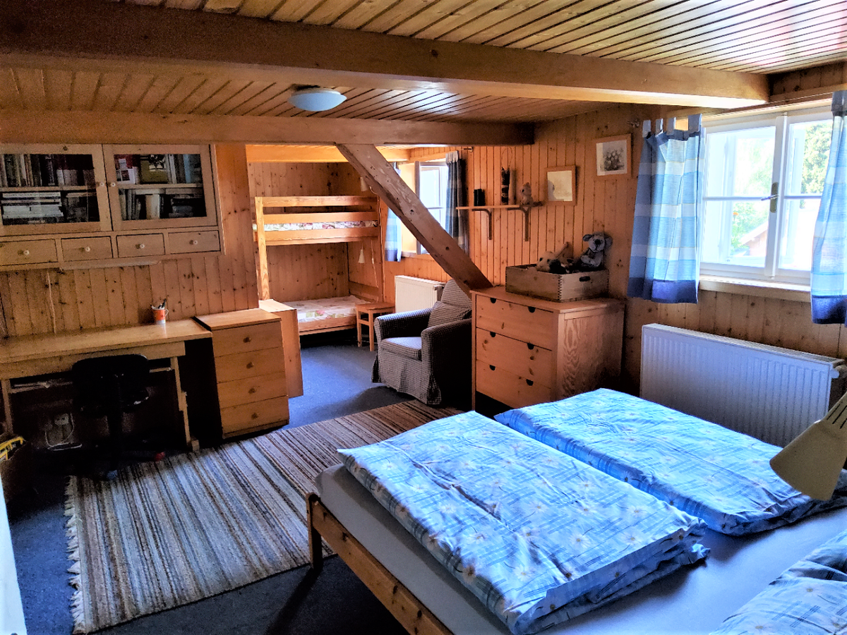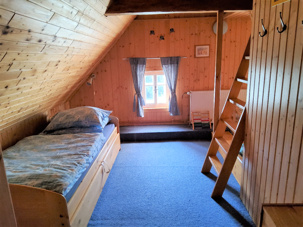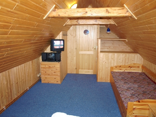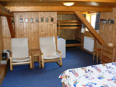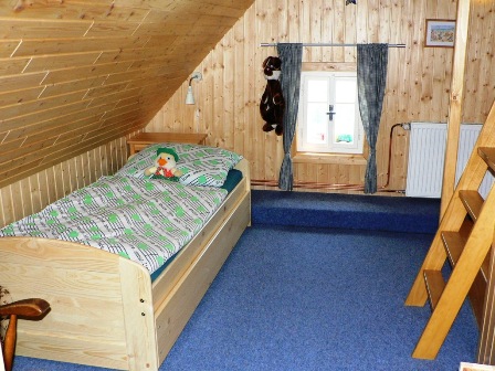* POKOJ č. 3 je patrový + dětská herna s množstvím hraček, 1x rozkládací dvojlůžko do roviny, 2x matracové lůžko v patře pokoje (velmi oblíbené dětmi), křeslo, prádelník, věšáky a sušák na topení. V případě potřeby lze rozšířit o jednu matraci v patře.