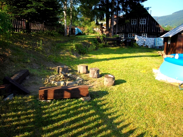 * ZAHRADA částečně oplocená s dostatkem prostoru pro hry v letních měsících s trampolínou a bazénem o průměru 4m. Dále je zde velká pergola, prolézačka, pískoviště, ohniště s lavicemi a stolkem, uzavíratelná studánka, kde se výborně chladí pivo a jezírko s rybičkami. Zdarma můžete využít gril na dřevěné uhlí, bandbington, líný tenis, petanque, míče apod.